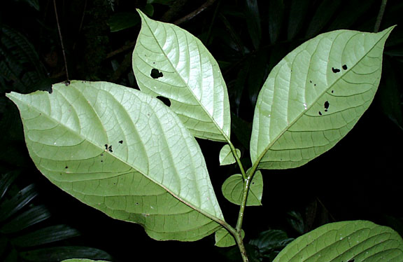 Description. Weak treelet, mature at 2-5 m; twigs with swollen nodes, often with two dorsal ridges; leaves alternate, usually paired, to 10 x 22 cm, minor leaf to 4 cm, almost round, blade glabrous, elliptic, acuminate, base asymmetric, inflorescence 1-15 mm, arising between leaf pairs, bearing 3-15 buds and flowers at once; flowers 4-parted, glabrous, with pedicel 15 mm, calyx 4-5 mm, without lobes, corolla 12-16 mm, free to calyx margin, pale green, waxy, shiny, anthers 3 mm cream; fruit Similar species. Cuatresia riparia is more common, has narrower leaves, and larger, sessile, yellow flowers. Solanum ramonense is mature at less than 1 m and has small white flowers. Local distribution. Pacific slope at 1500 m; Atlantic slope at 700-1200 m. Habitat. Forest edge, along streams, light gaps and open understory of mature forest. Species range. Nicaragua to Peru. Abundance. Uncommon. Phenology. Flower: ; Fruit: .